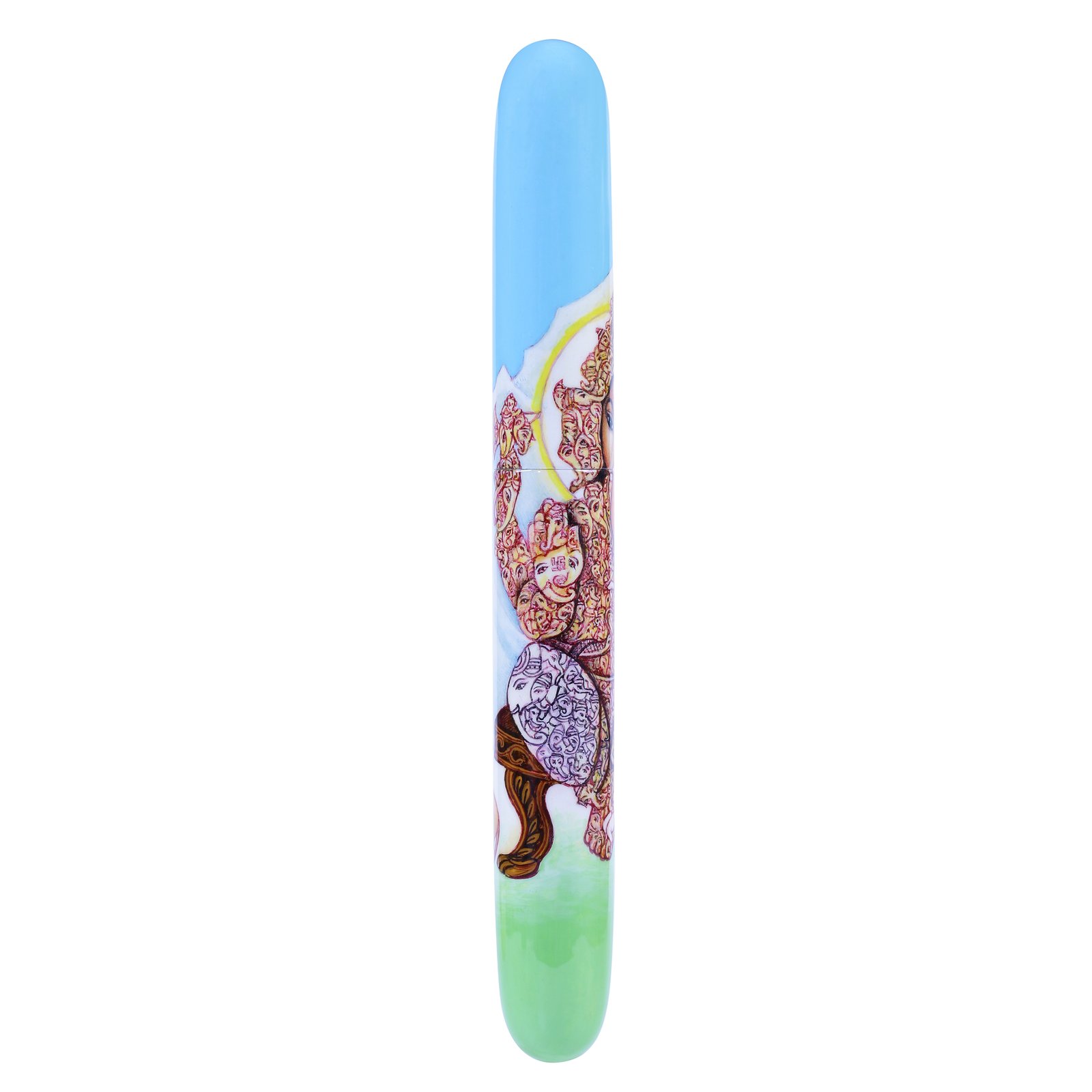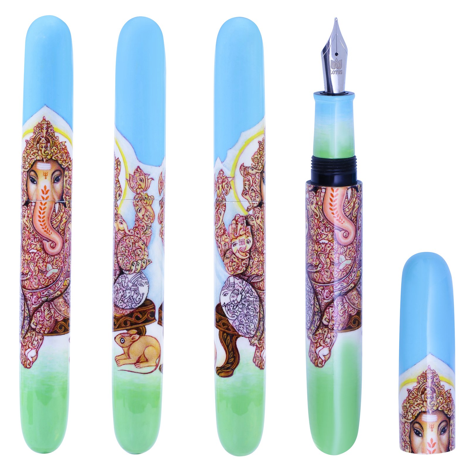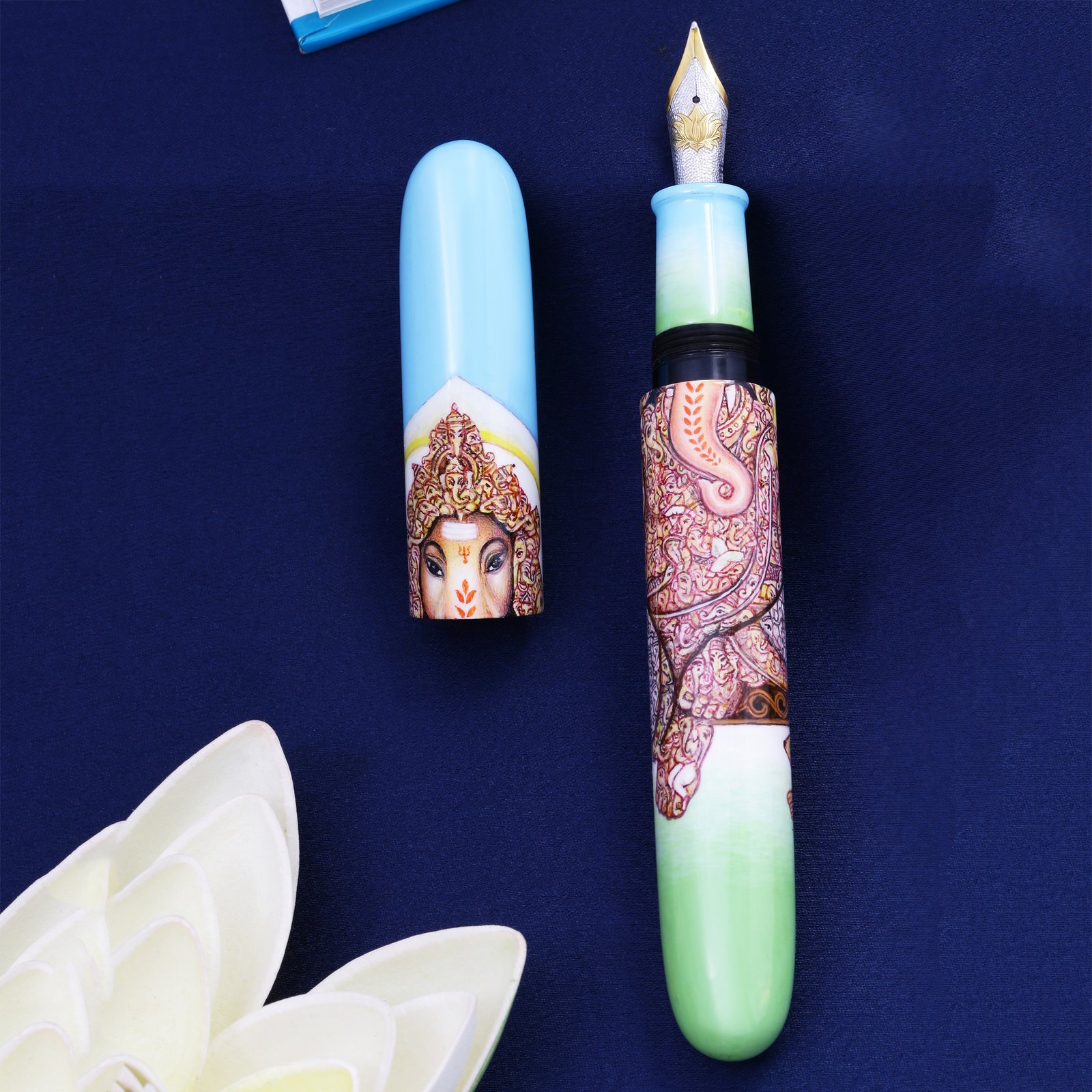 A Ganesha- fountain pen is a unique and artistic writing instrument that features designs inspired by Lord Ganesha, a revered deity in Hinduism. Ganesha, also known as Ganpati, is widely regarded as the remover of obstacles and the god of wisdom, knowledge, and new beginnings. The intricate Painting, showcasing the deity's iconic elephant head and human body. The color palette used for the pen is inspired by traditional Hindu art and features vibrant colors that represent the joyful and auspicious nature of Lord Ganesha.  Investing in a Ganesha-themed fountain pen can be a meaningful way to combine your love for writing and appreciation for art and spirituality.