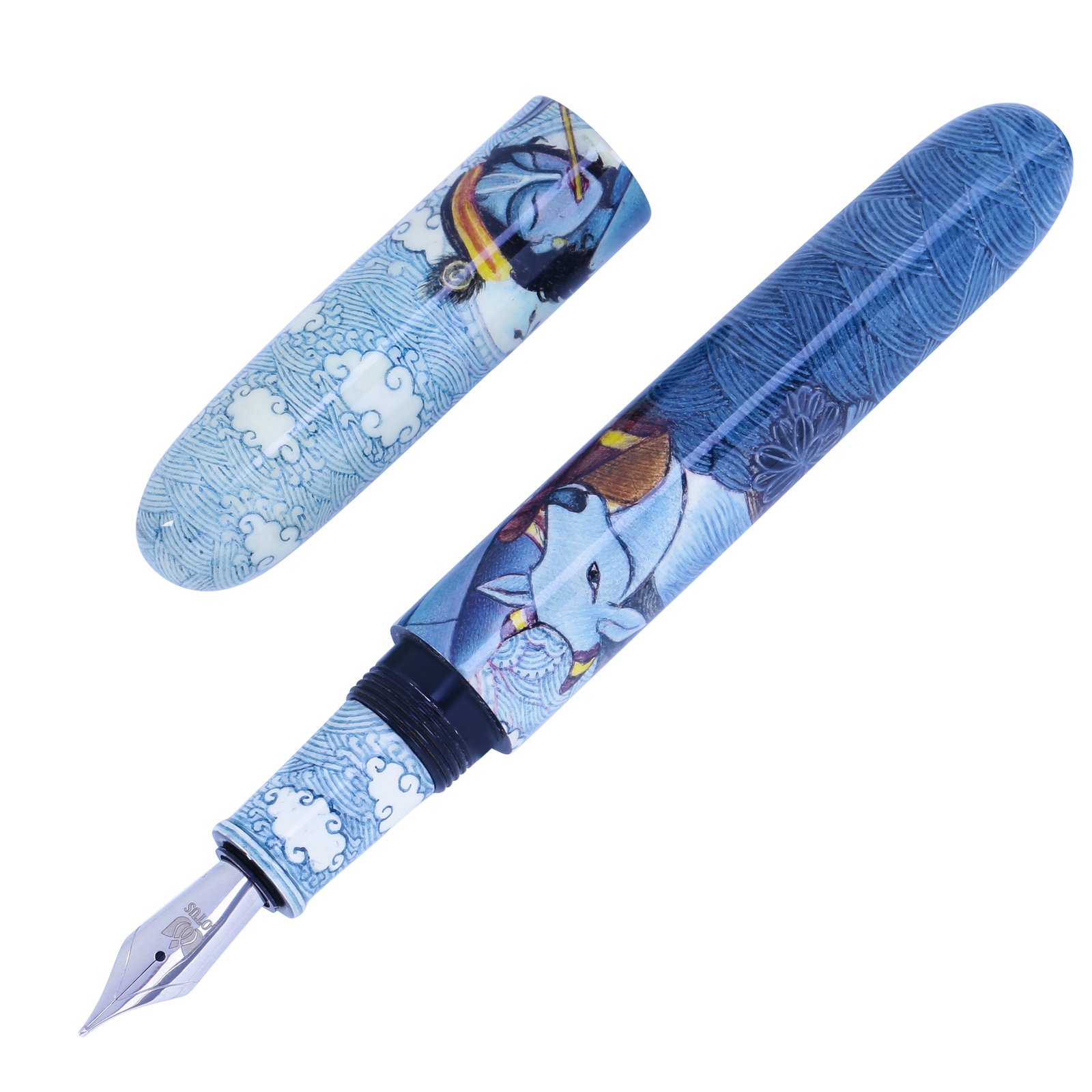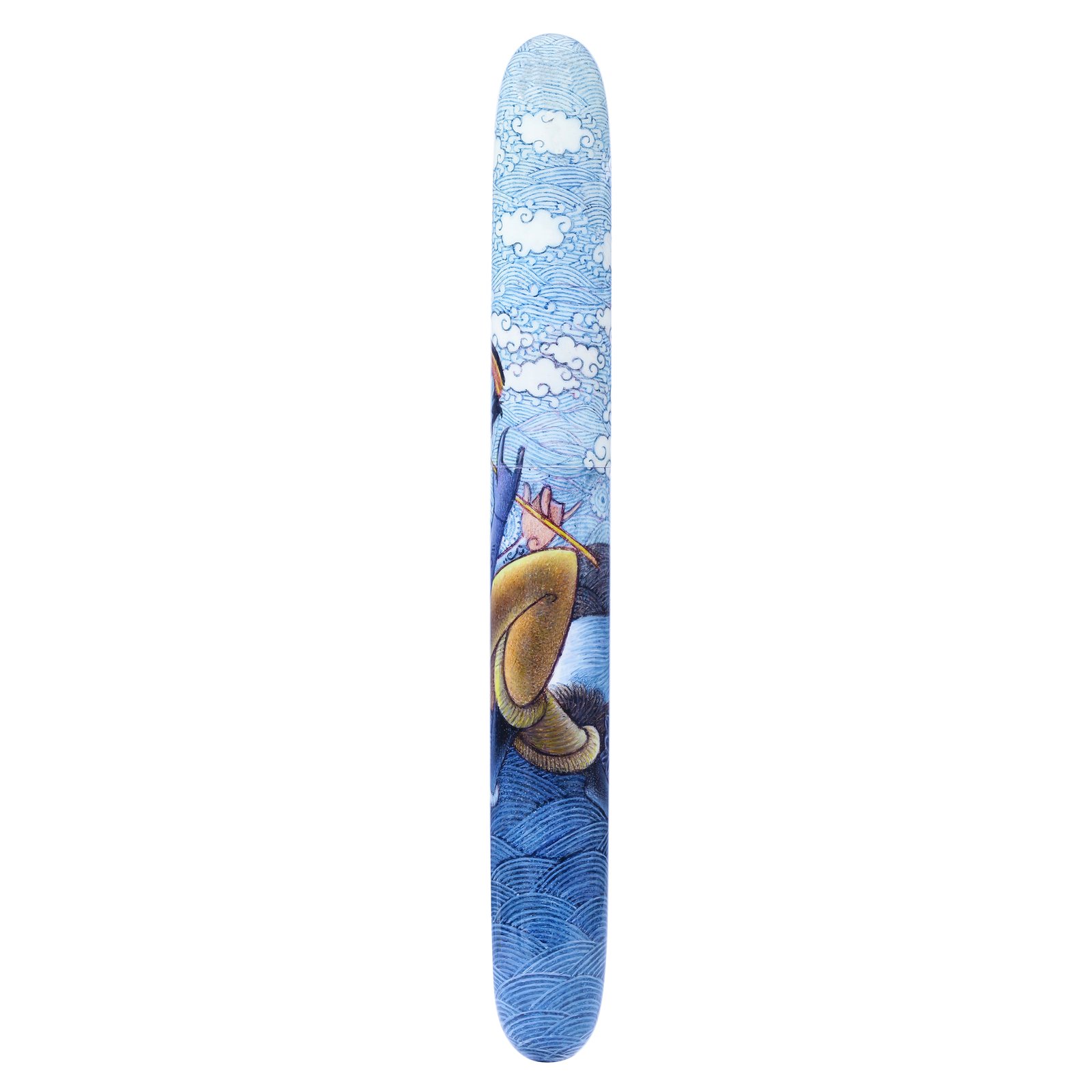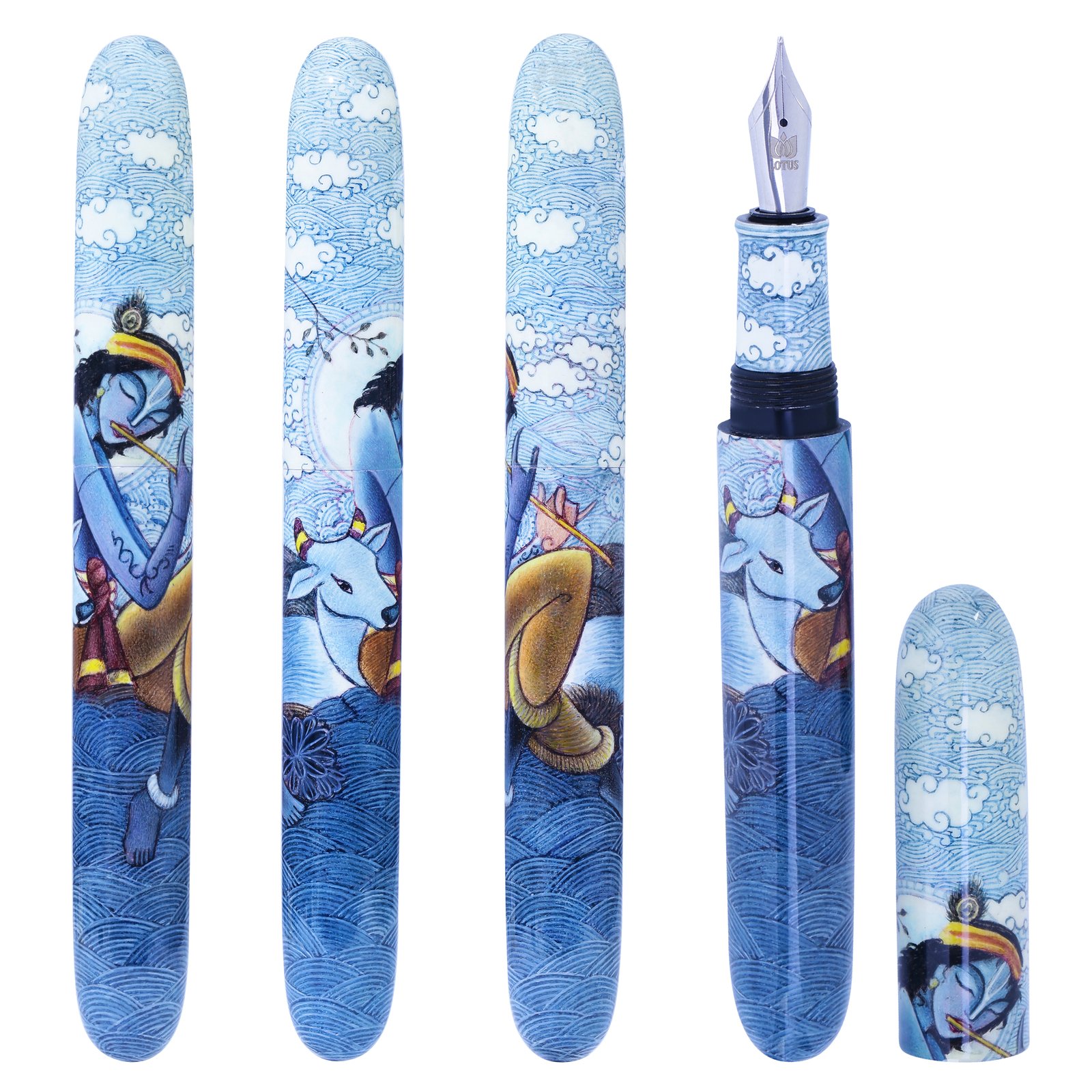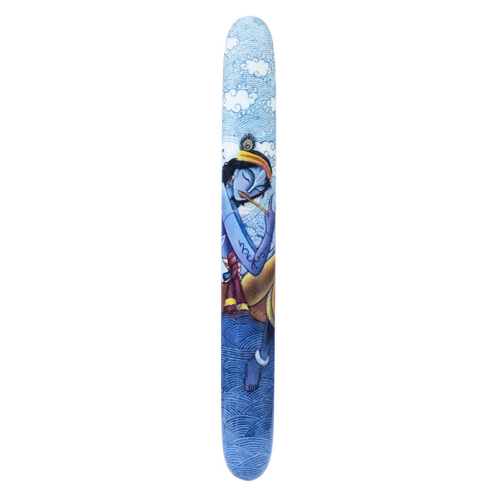 Hand-painted adorned with Krishna with his basuri, involves intricate detailing, and personalized touches that make each pen a piece of functional art. Using fine brushes, the artist has carefully applied paint to the pen's surface, layering colors and details to create the piece of art in reality. Once the pen is painted it is sealed with protective layer of lacquer several times to ensure longetivity.